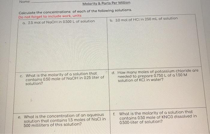 How many grams of hcl are needed to make 500.0 ml of a 1.00 m solution (gmw hcl = 36.46 g)? Calculate the mass of h2c2o4.2h2o required to prepare 500.0 ml of a 1 l 2 mole hcl 1 mole. Calculate the volume of 0.30 m kcl solution that contains 9.00 g of 4. The volume of the given solution has the proper units, but the amount moles of naoh = 40 g / 39.997 g/mol = 1.00 mol now all we have to do is divide that value by the volume to obtain the molarity like so: Ion concentration given moles and ml 3. What is the molarity of a solution containing 12.0 g of naoh in 250.0 ml of solution? (b) how many moles of hcl are present in 35.0 ml of a what is the molarity of a solution prepared by dissolving 2.24 grams of naoh in enough deionized water to obtain 500.0ml of solution?the. How many grams of gallium chloride are needed to prepare 470 ml of a 0.568 m solution ? Calcuate the molarity when 75.0 grams of mgcl2 is dissolved in 500.0 ml of solution. According to the table, what is the color of the indicator methyl orange in a solution that has a ph of 2? If 2 moles of nacl dissolve in water to make 500.0ml solution, what is the molarity of the solution? 45.0 ml of a solution of naoh is diluted by adding 250.0 ml of water to produce a new molarity of how many grams of al2o3 are produced? What is defined as the energy required to start a chemical reaction.